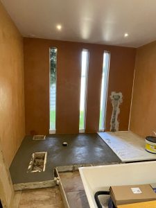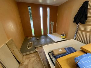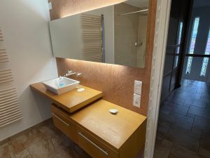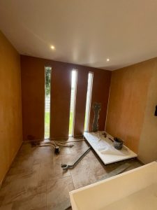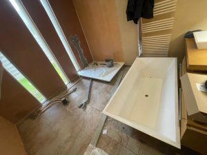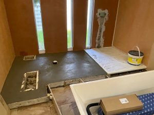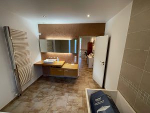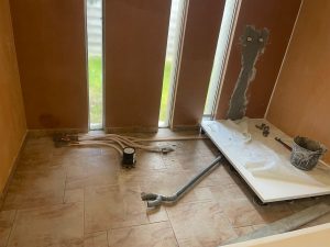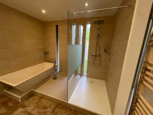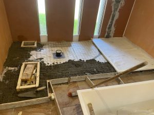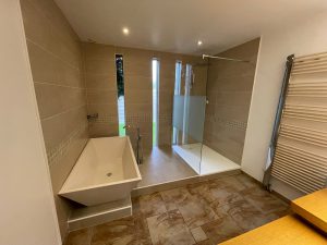 Rénovation complète de salle de bain: pose de carrelage au sol at aux murs, et installation d’un espace douche ainsi que d’une baignoire séparés par une paroi.
