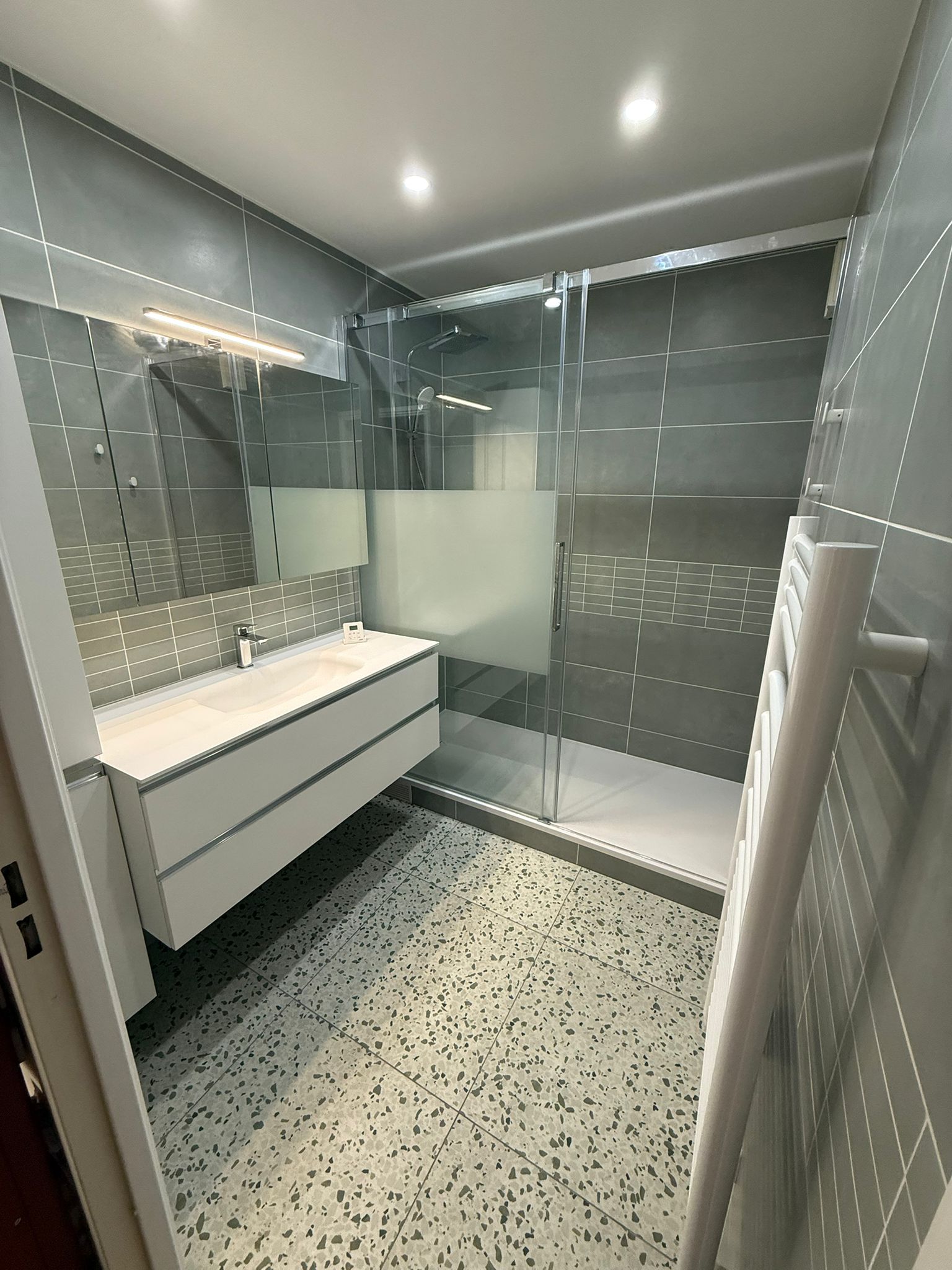 Refonte totale d’une salle de bains: remplacement baignoire par espace douche avec porte, inversion robinetterie de droite à gauche, carrelage sol et murs, pose mobilier et porte de douche.