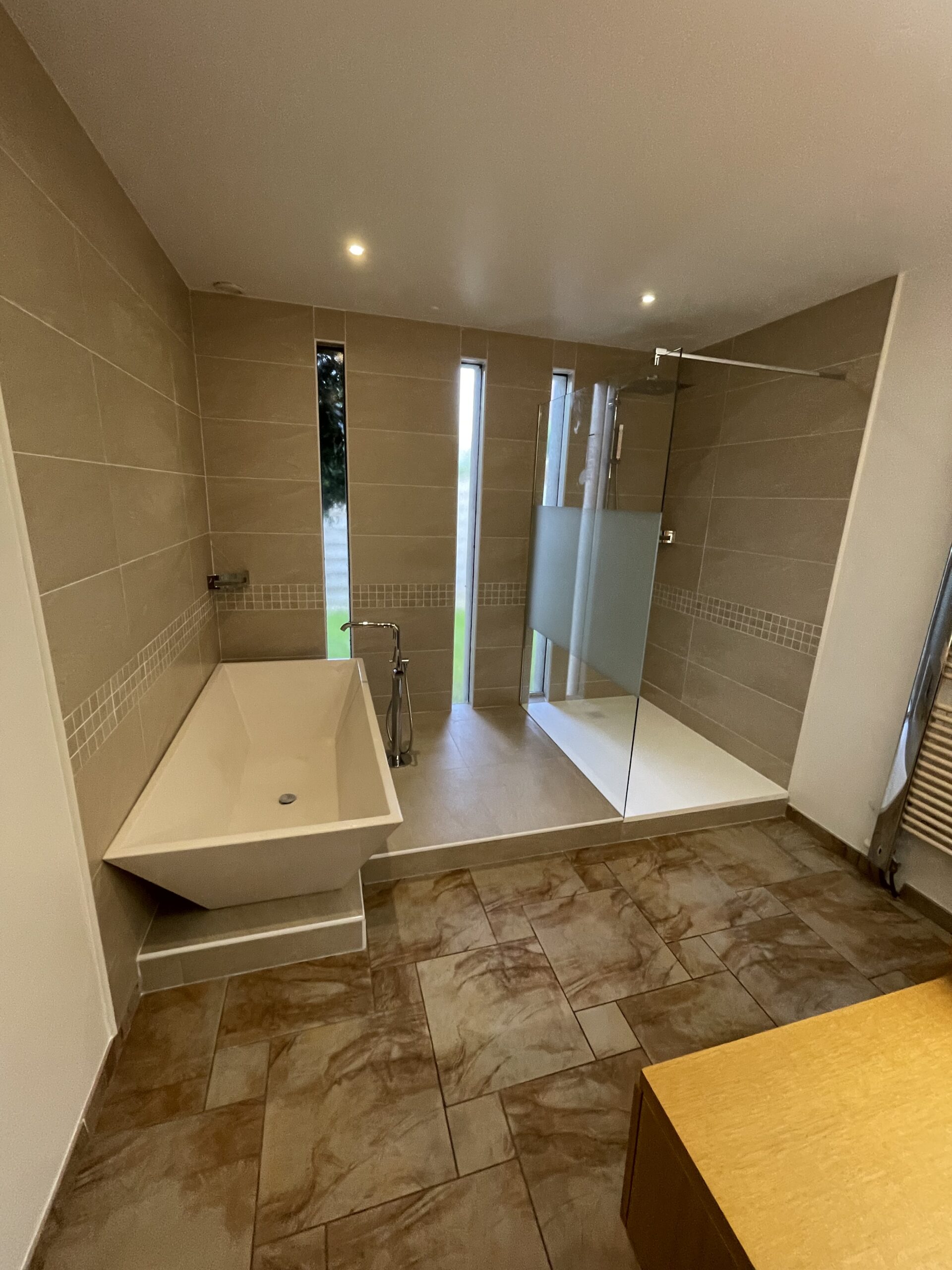 Rénovation complète de salle de bain: pose de carrelage au sol at aux murs, et installation d’un espace douche ainsi que d’une baignoire séparés par une paroi.