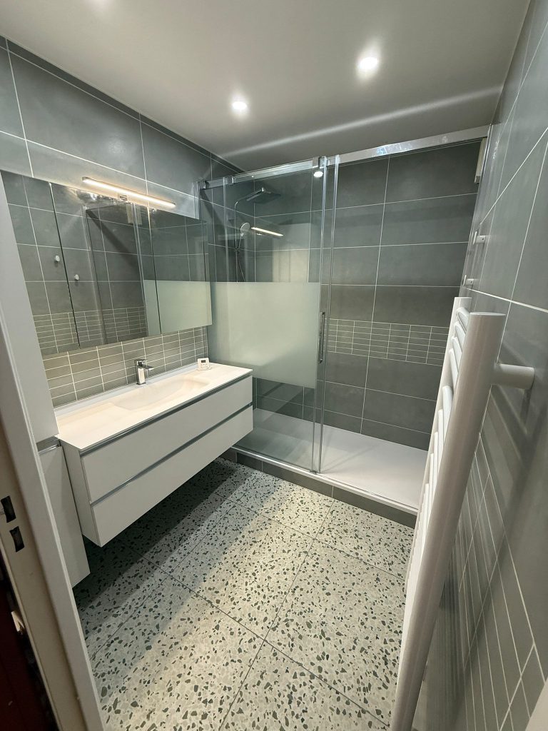 Rénovation complète de salle de bain: pose de carrelage au sol at aux murs, et installation d’un espace douche ainsi que d’une baignoire séparés par une paroi.